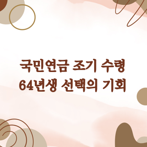 언제 국민연금을 받으실 계획이신가요? 64년생 분들에게는 새로운 선택의 기회가 찾아왔습니다. 조기 수령을 통해 더 빨리 연금 혜택을 누릴 수 있지만, 그에 따른 감액도 고려해야 합니다. 과연 어떤 선택이 가장 현명할까요?