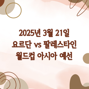 축구 팬 2026년 FIFA 월드컵 아시아 예선 경기가 어떻게 진행되고 있는지 궁금하지 않으신가요? 특히 이번 3월 21일에 열리는 요르단과 팔레스타인의 대결은 어떤 결과가 나올지 기대되지 않나요?